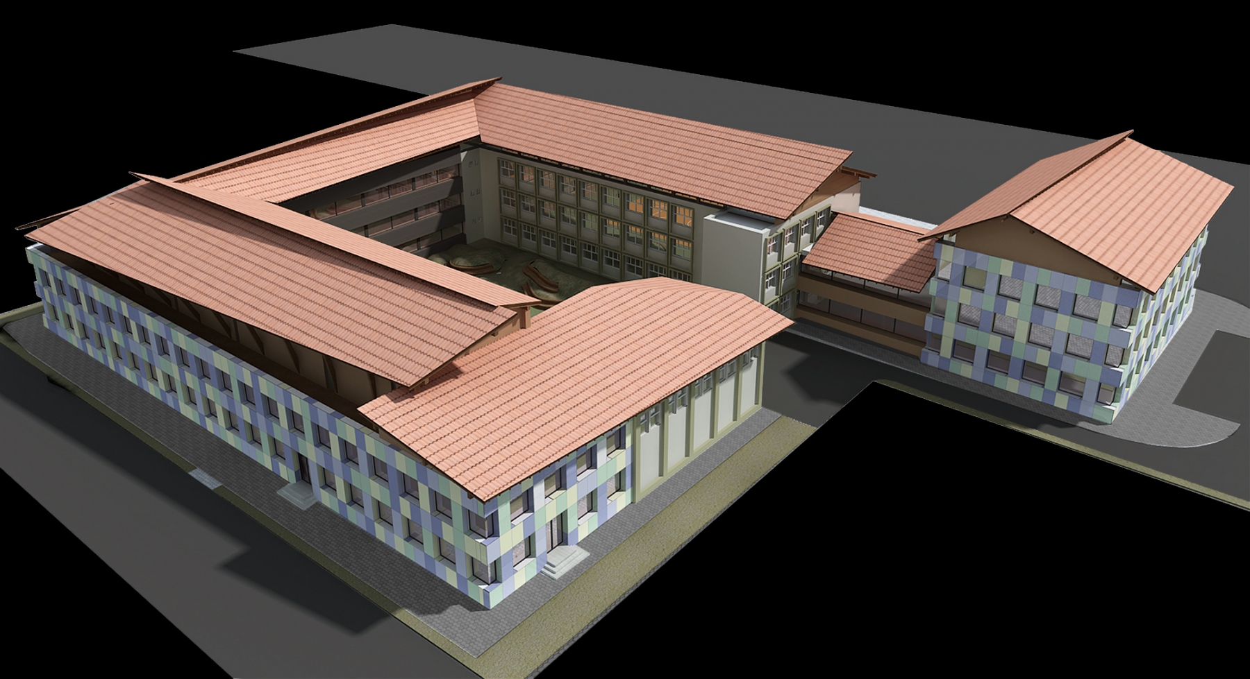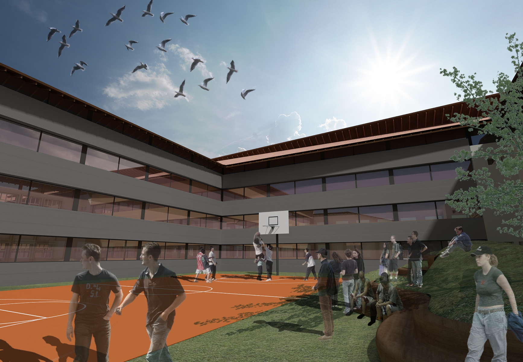 the idea of the project consisted in taking over a “cloister”-type conceptual planimetric landmark that creates the feeling of community and campus-type exclusivity among the teenagers.