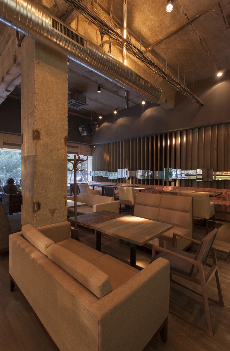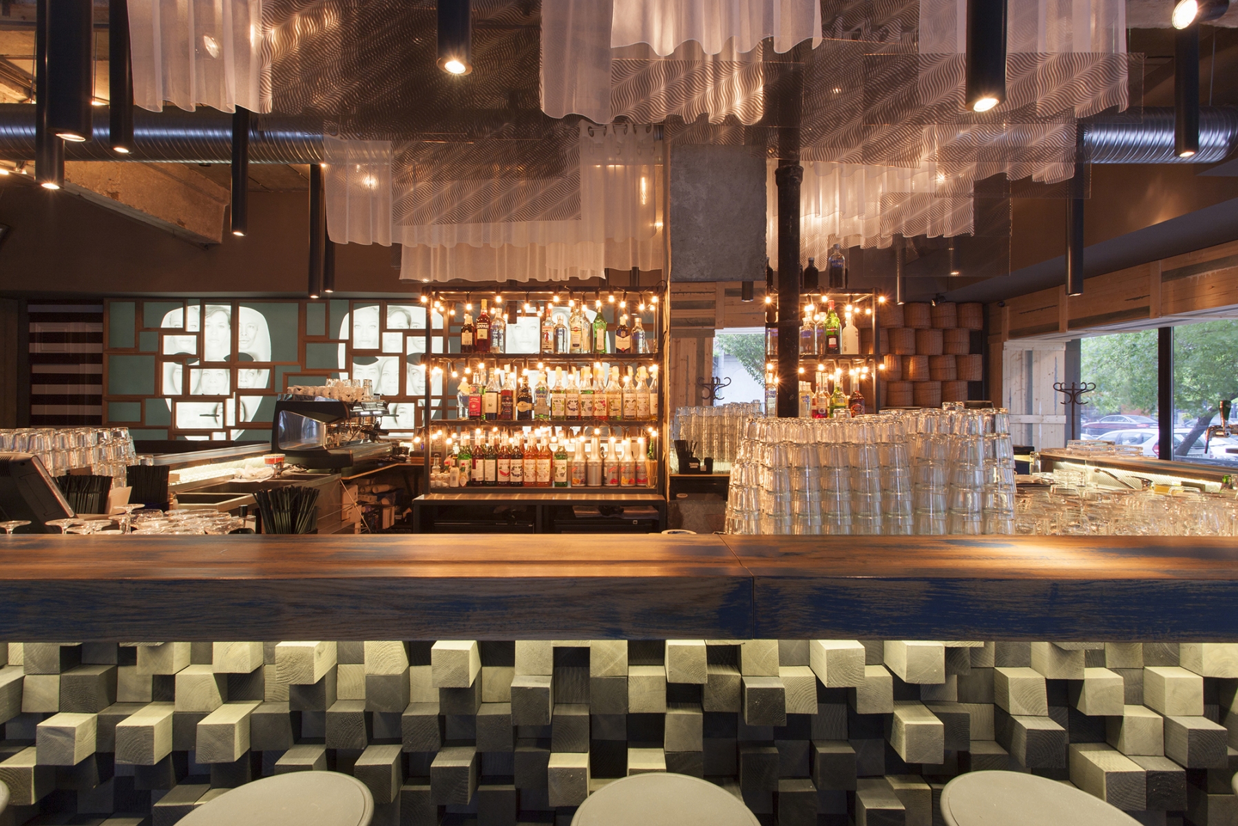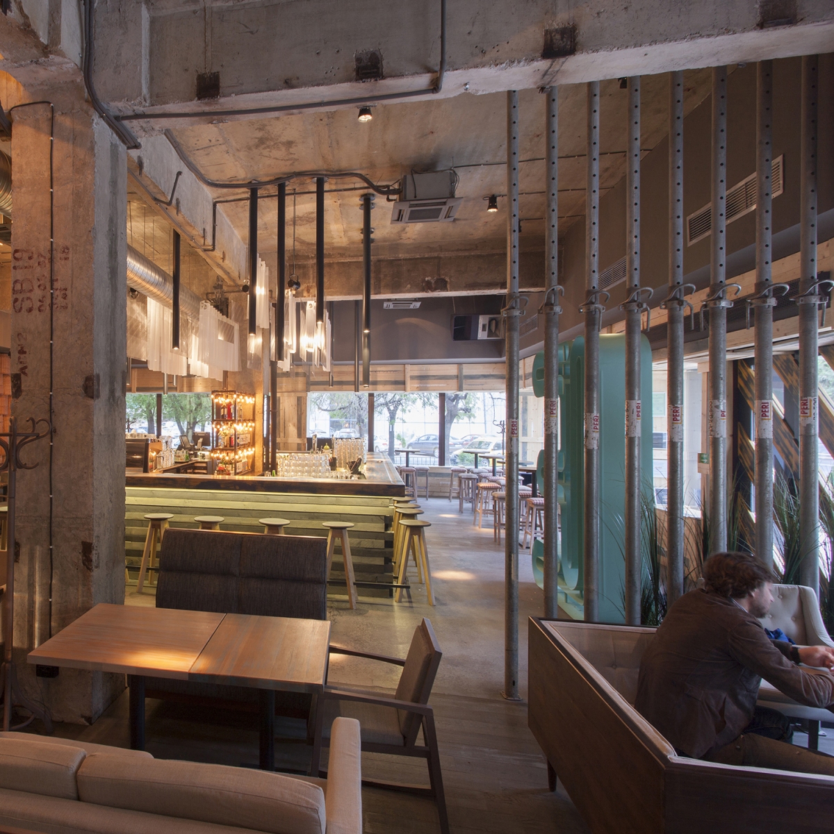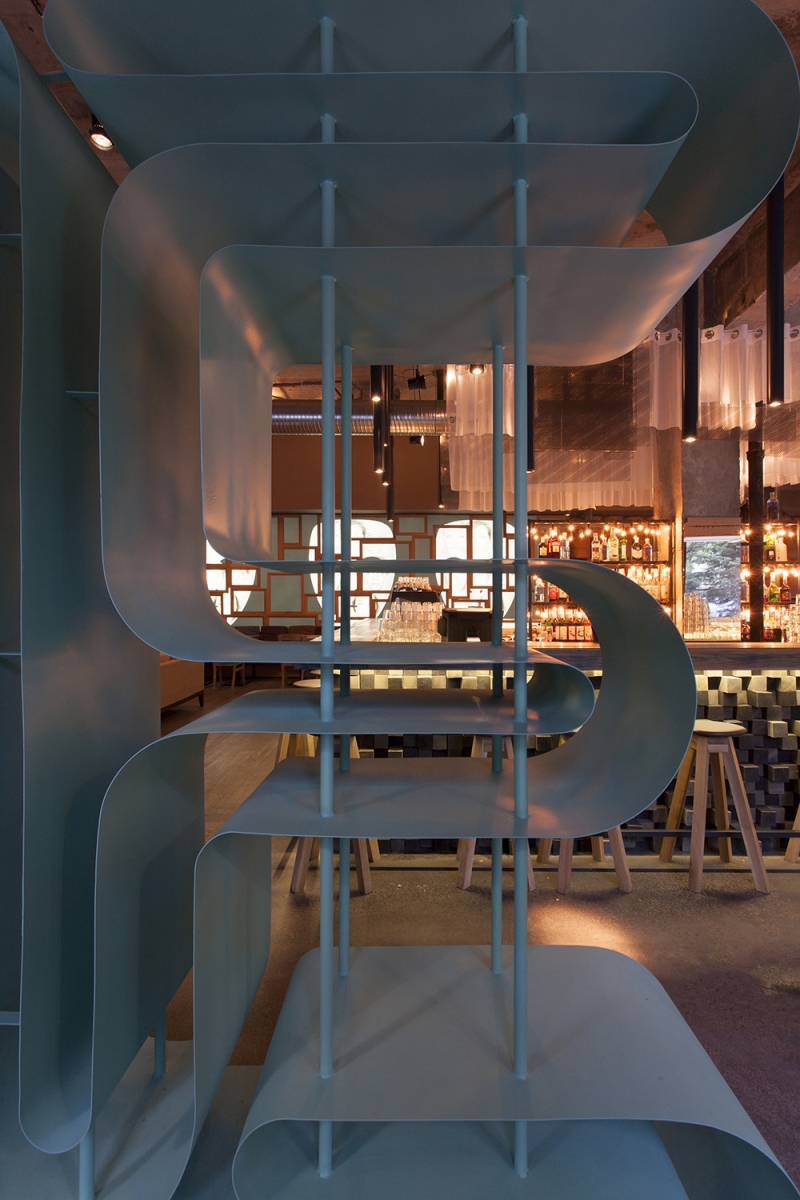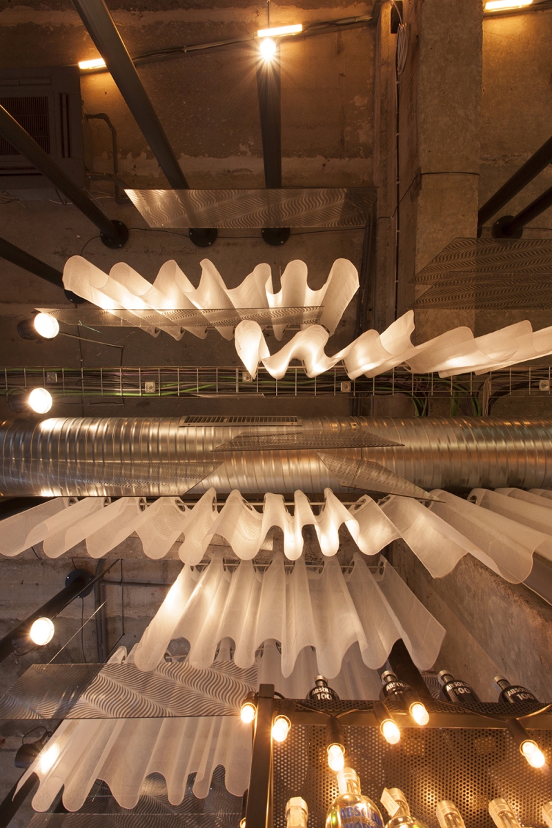 “Entourage” means first socializing but also what we want to become and leave behind us into a big marriage with the future. we must take socializing on different layers as a positive game, first with ourselves. it is a game that helps us not being subordinated to some dogmas, it is a game that should make us expect to learn continuously… also that we are in a continuous workout in this construction site of our souls. the construction site as a simple environment, instantly accesible, existing in non-finished, recycled state is what is enough to have and use in this performance of mutual meeting. it is a stage in which the purity of materials – wood, concrete, metal, glass – exposes to meeting in the same time our entourage and our sublimation… the rough materials brought into dialogue by the rythm and the anti-rythm are a constant theme of this place’s ambient. the bar is a first counter where since you get close to you dock to the proposed socializing game. the three huge graphic masques as an enlighting wall across the entrance composed from diverse faces, culturally ambiguous, show the light of the great déjà vu that we join. the filter of an imposing “E” at the entrance reminds us that we pass the portal to a new state of mind – Entourage3.
