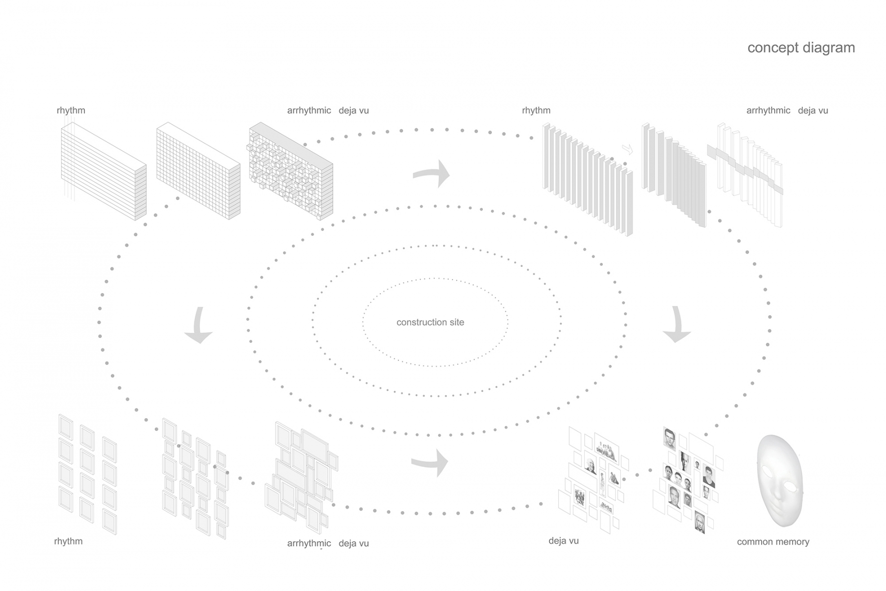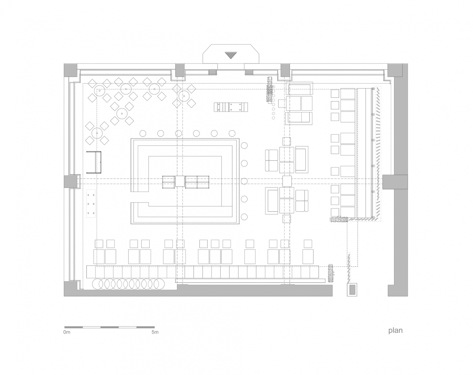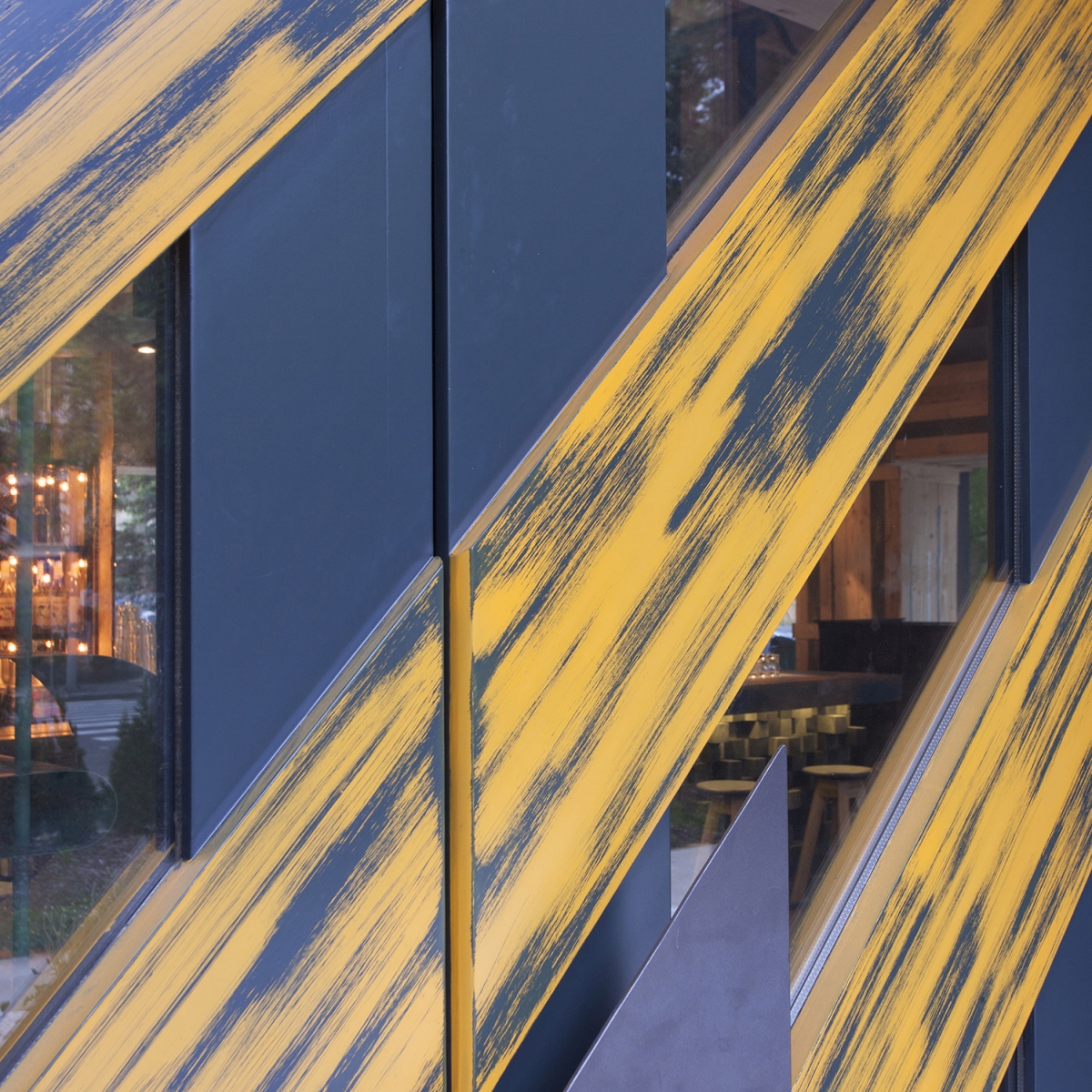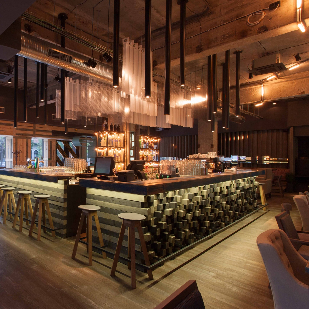“Entourage” means first socializing but also what we want to become and leave behind us into a big marriage with the future. we must take socializing on different layers as a positive game, first with ourselves. it is a game that helps us not being subordinated to some dogmas, it is a game that should make us expect to learn continuously… also that we are in a continuous workout in this construction site of our souls. the construction site as a simple environment, instantly accesible, existing in non-finished, recycled state is what is enough to have and use in this performance of mutual meeting. it is a stage in which the purity of materials – wood, concrete, metal, glass – exposes to meeting in the same time our entourage and our sublimation… the rough materials brought into dialogue by the rythm and the anti-rythm are a constant theme of this place’s ambient. the bar is a first counter where since you get close to you dock to the proposed socializing game. the three huge graphic masques as an enlighting wall across the entrance composed from diverse faces, culturally ambiguous, show the light of the great déjà vu that we join. the filter of an imposing “E” at the entrance reminds us that we pass the portal to a new state of mind – Entourage3.