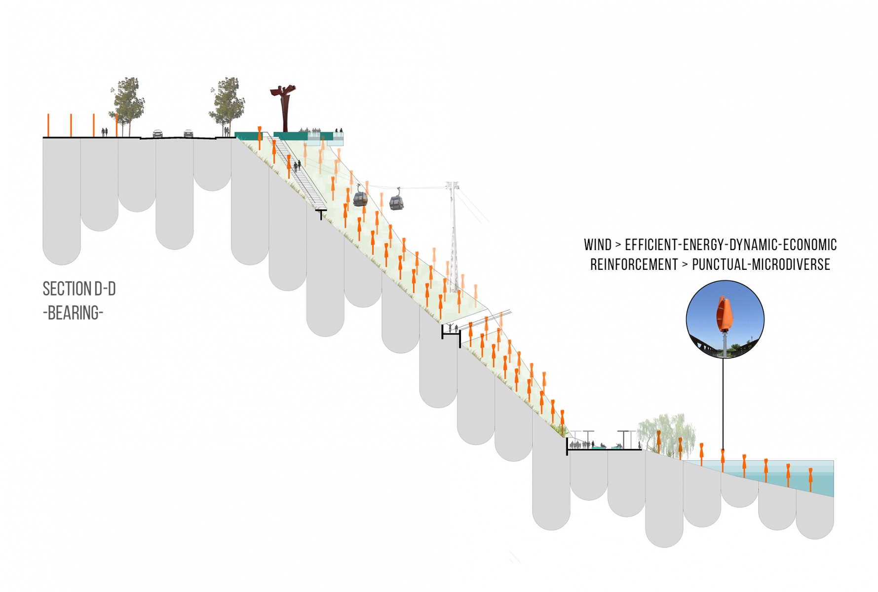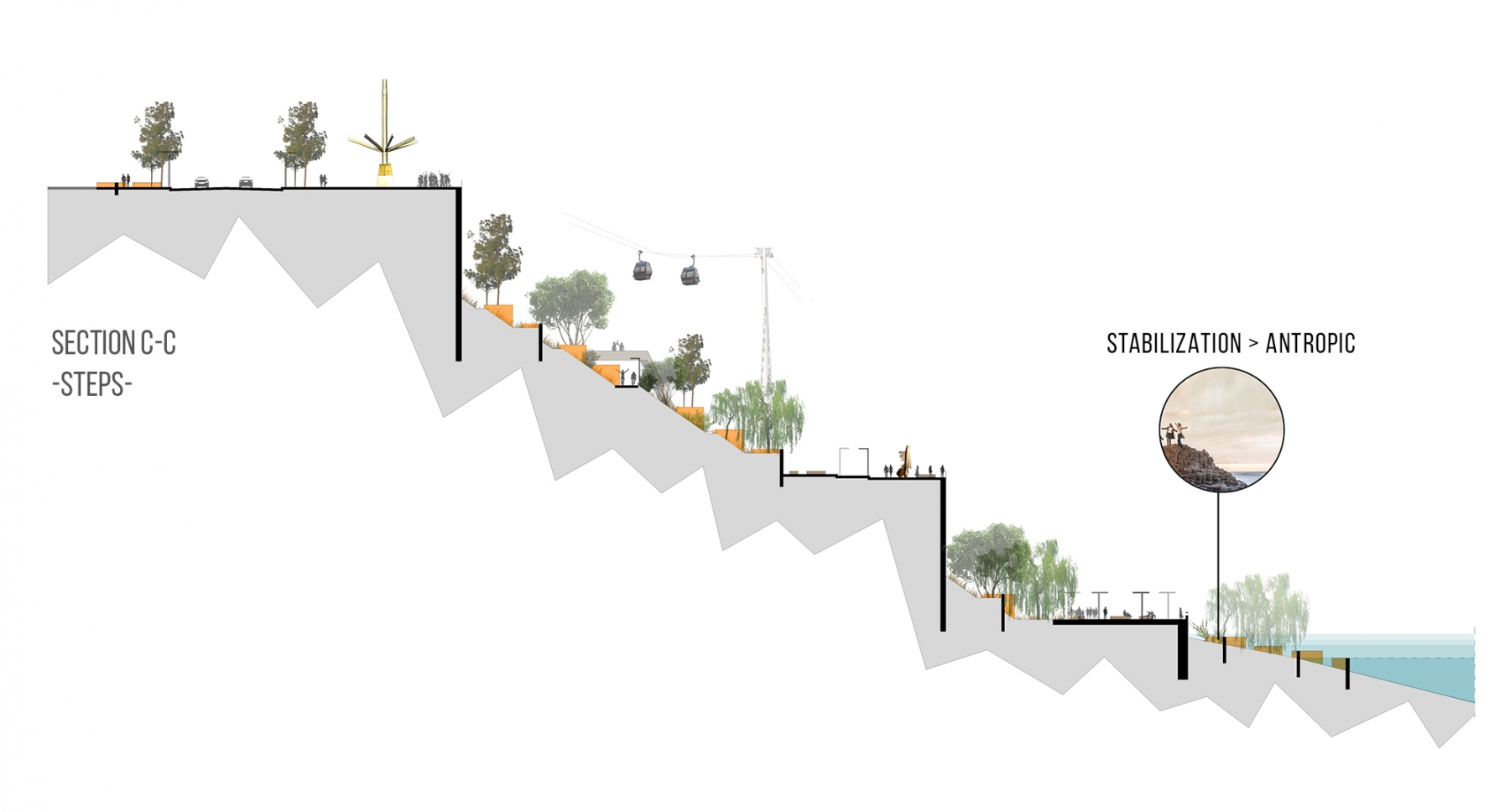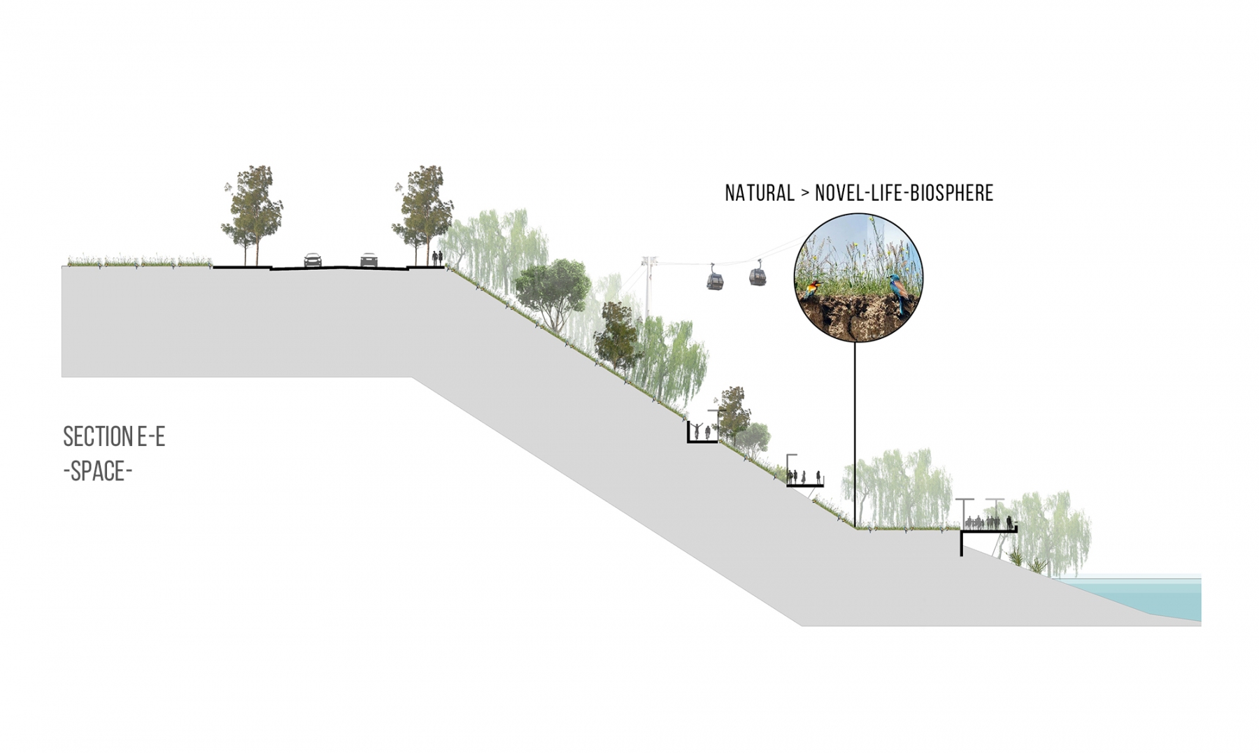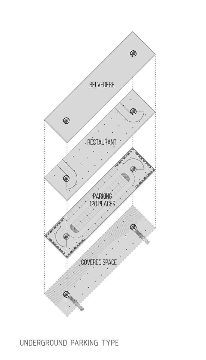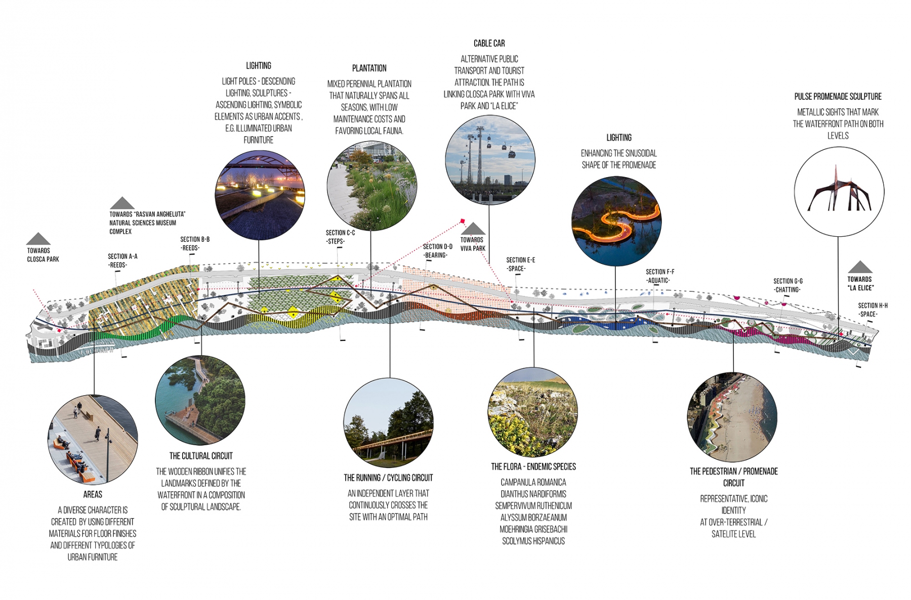 the waterfront is transformed into 5 different worlds, variously furnished with mineral elements that define the anthropic and recreate the human scale, united by spaces that are mostly vegetal. three underground car parks with 120 spaces each are proposed in these connecting spaces, on the terraces of which are arranged places for walks and belle vue. also in these spaces, at carefully selected strategic points, are small cafĂ©-type areas that act as social attractors and vibrant elements. the three levels of the cliff, defined by the natural slope of the land, are exploited through the development of three flows, pedestrian, bicycle and cultural, and through their rational collection and redistribution. the cultural circuit, a sculptural landscape composition, runs upstream and downstream through the existing suite of representative sculptures and develops on a level of complex perspectives, framing and regenerating the works of art as urban landmarks, giving a positive impulse for new artistic projects. the pedestrian/walkway circuit creates the state of mind in which each inhabitant finds himself, in a diverse anthropic arrangement, a cultural path at micro-zonal level in a positive contemplative mood. the walking/biking circuit follows the optimal route that crosses the site in a harmonious and friendly way, putting the participants in the position of travellers on the Danube. the 3 trails intertwine and intersect in a network of confluences that define the trans-european east-west longitudinal axis and act at the same time as urban anchors that attract the Galician population and activate the space. these are either small urban squares, harmoniously combining natural plant elements with urban furniture, or pseudo-amphitheatres. the diversity of the paving gives a “playful” touch to the whole design. the two existing kiosks on landing 1 have been reinstated in an improved and updated form. the project proposes a 4th flow/circuit that complements the other 3 at aerial level, by creating a cable car route linking the Danube waterfront with key urban elements such as Closca, Viva and La Elice parks. in order to strengthen the physical link between the waterfront and the city, it is proposed to integrate the Viva Park into the waterfront development solution. it is to become an intermodal hub for alternative public transport (pedestrian, bicycle and cable car). this link is also marked by the contemporary redesign of the staircases linking landings 1 and 3.