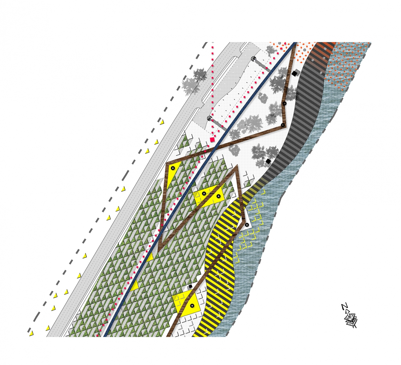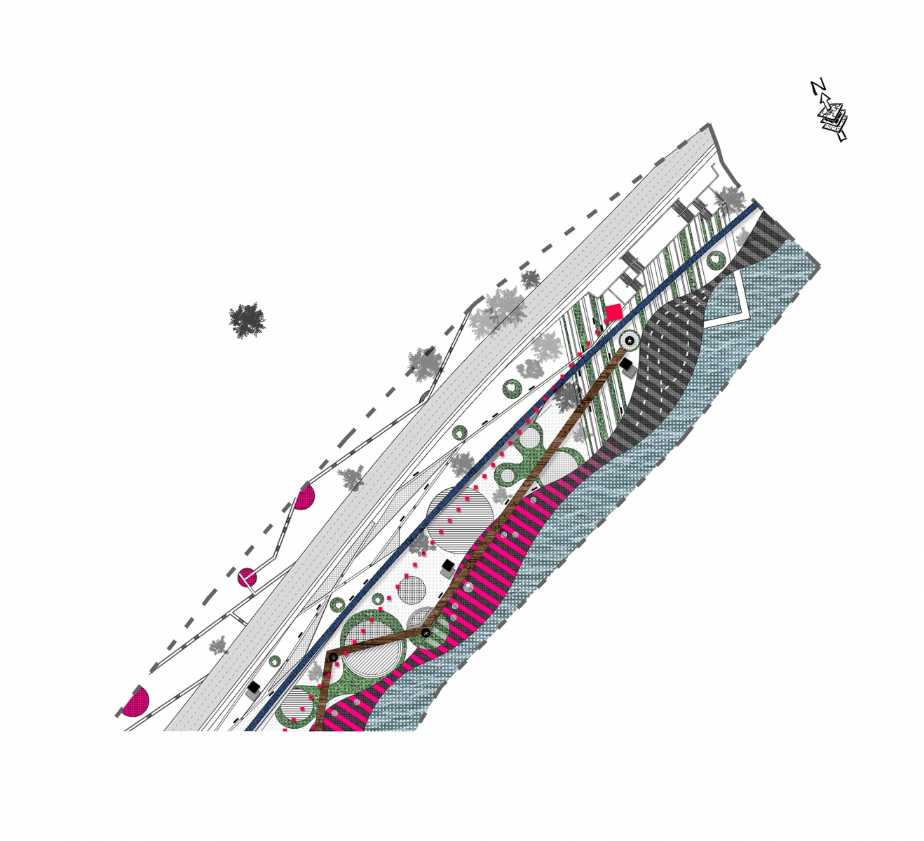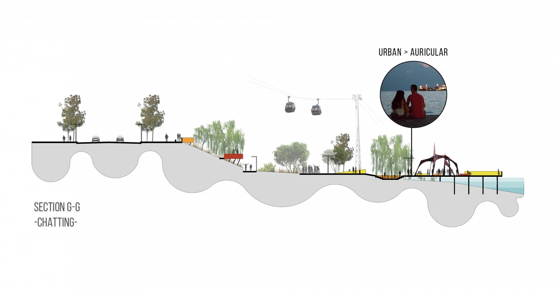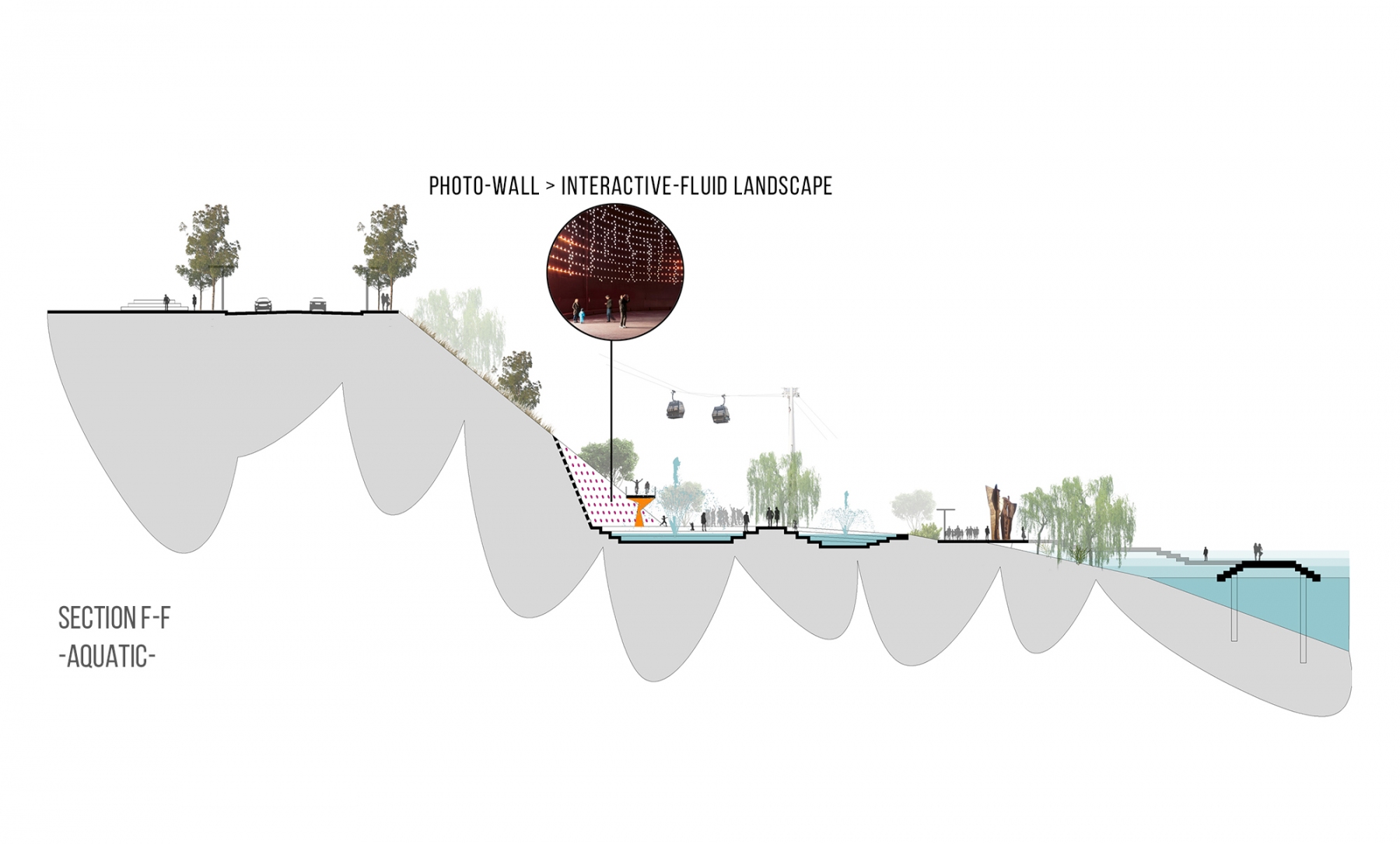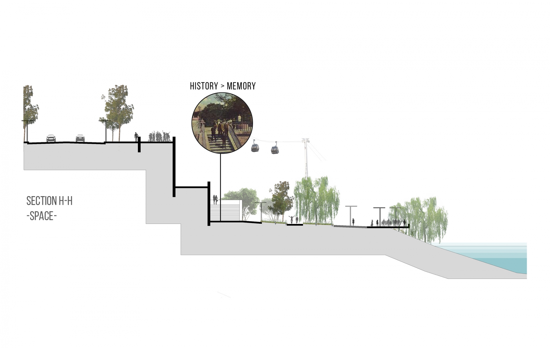 the waterfront is transformed into 5 different worlds, variously furnished with mineral elements that define the anthropic and recreate the human scale, united by spaces that are mostly vegetal. three underground car parks with 120 spaces each are proposed in these connecting spaces, on the terraces of which are arranged places for walks and belle vue. also in these spaces, at carefully selected strategic points, are small cafĂ©-type areas that act as social attractors and vibrant elements. the three levels of the cliff, defined by the natural slope of the land, are exploited through the development of three flows, pedestrian, bicycle and cultural, and through their rational collection and redistribution. the cultural circuit, a sculptural landscape composition, runs upstream and downstream through the existing suite of representative sculptures and develops on a level of complex perspectives, framing and regenerating the works of art as urban landmarks, giving a positive impulse for new artistic projects. the pedestrian/walkway circuit creates the state of mind in which each inhabitant finds himself, in a diverse anthropic arrangement, a cultural path at micro-zonal level in a positive contemplative mood. the walking/biking circuit follows the optimal route that crosses the site in a harmonious and friendly way, putting the participants in the position of travellers on the Danube. the 3 trails intertwine and intersect in a network of confluences that define the trans-european east-west longitudinal axis and act at the same time as urban anchors that attract the Galician population and activate the space. these are either small urban squares, harmoniously combining natural plant elements with urban furniture, or pseudo-amphitheatres. the diversity of the paving gives a “playful” touch to the whole design. the two existing kiosks on landing 1 have been reinstated in an improved and updated form. the project proposes a 4th flow/circuit that complements the other 3 at aerial level, by creating a cable car route linking the Danube waterfront with key urban elements such as Closca, Viva and La Elice parks. in order to strengthen the physical link between the waterfront and the city, it is proposed to integrate the Viva Park into the waterfront development solution. it is to become an intermodal hub for alternative public transport (pedestrian, bicycle and cable car). this link is also marked by the contemporary redesign of the staircases linking landings 1 and 3.