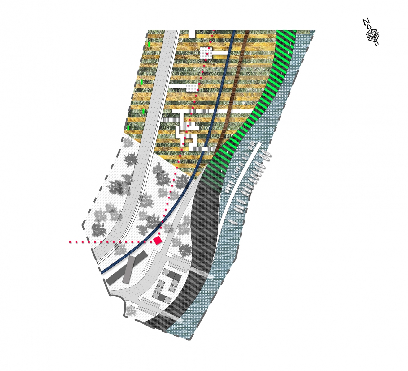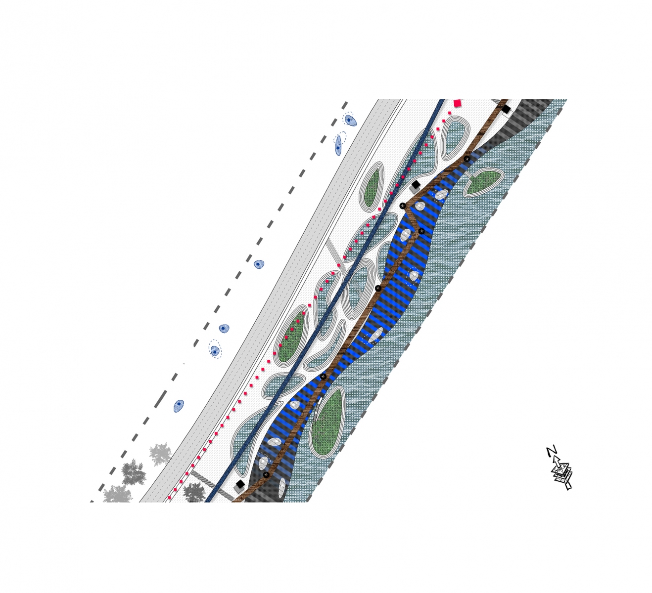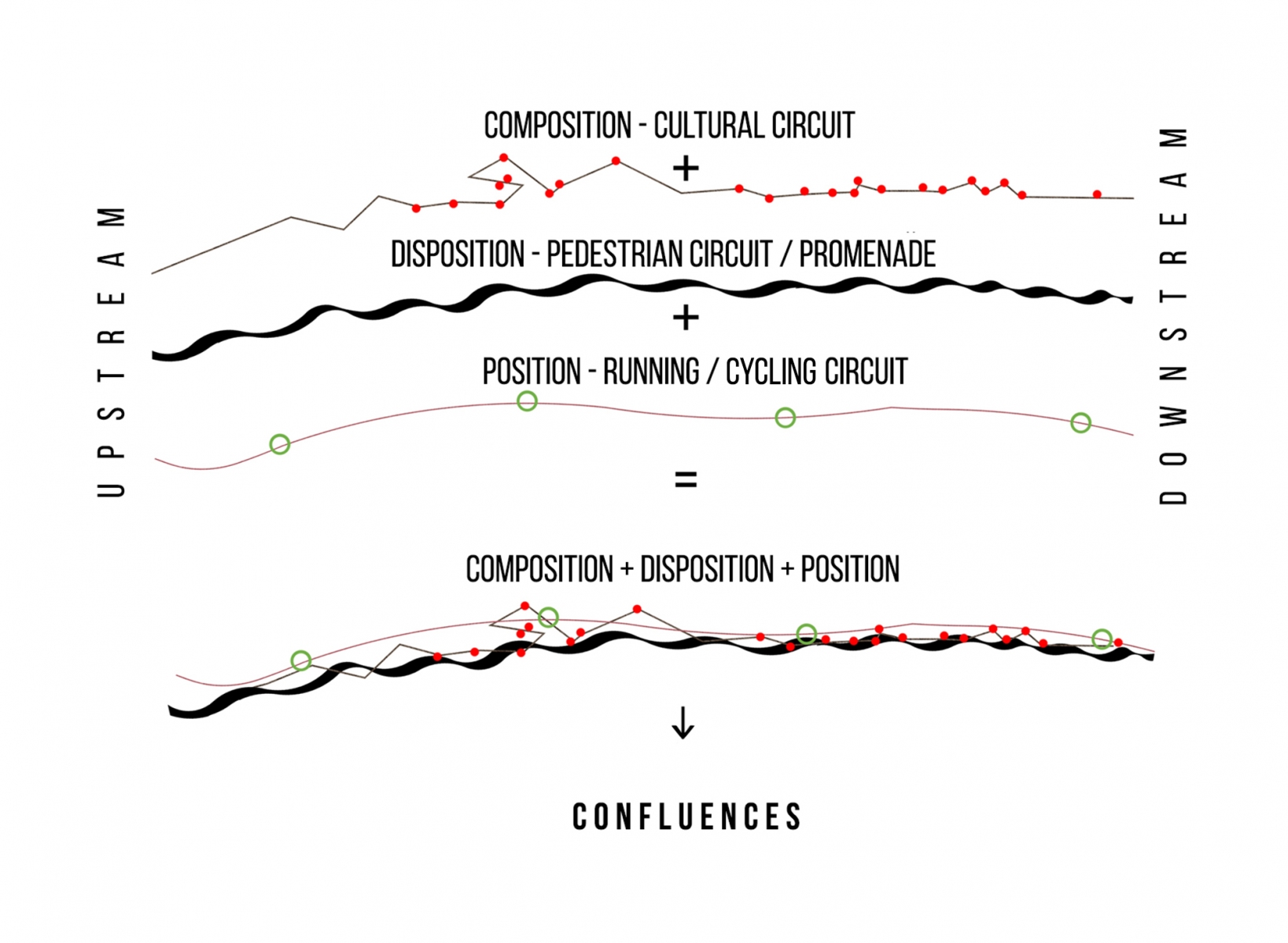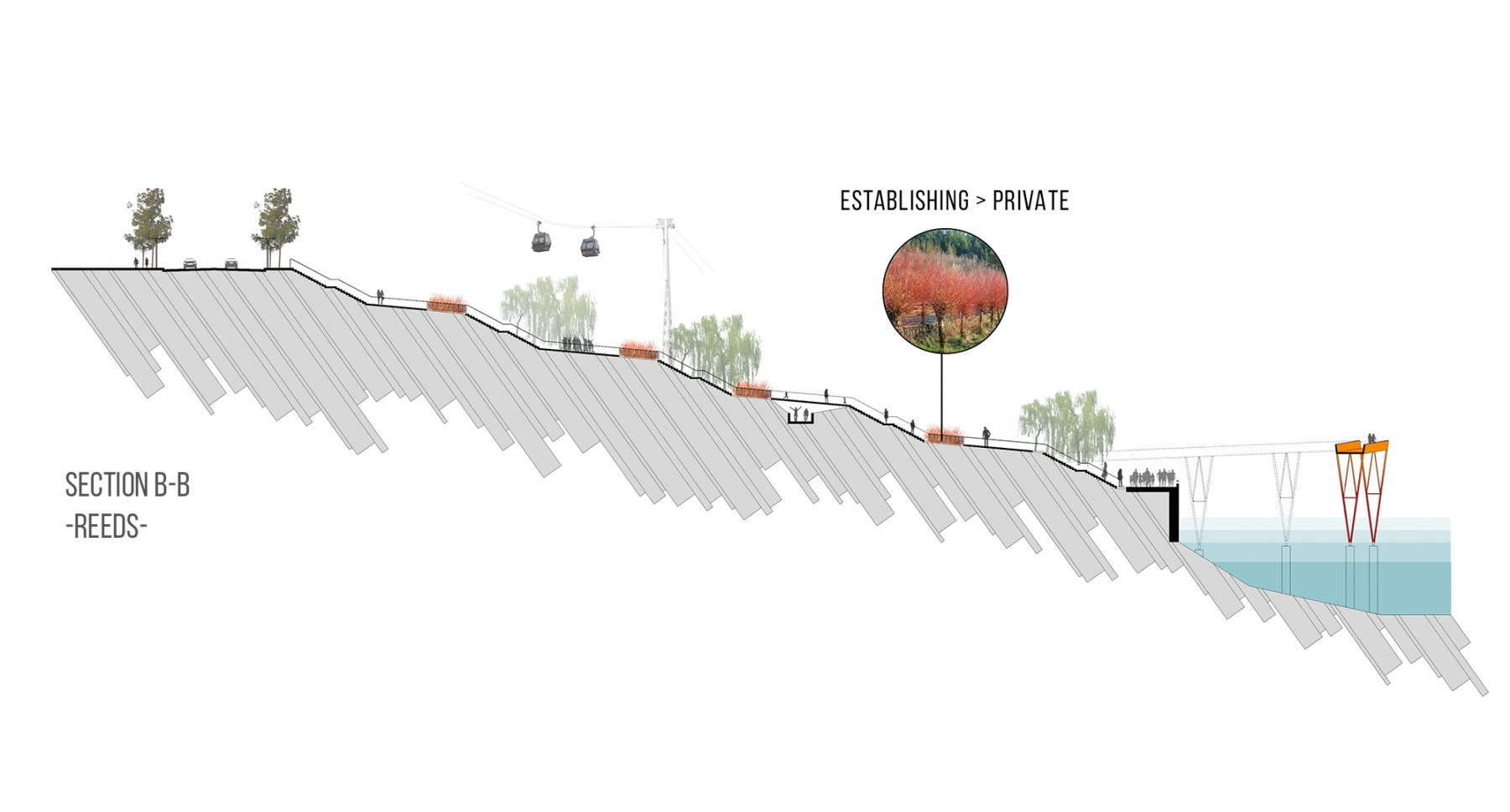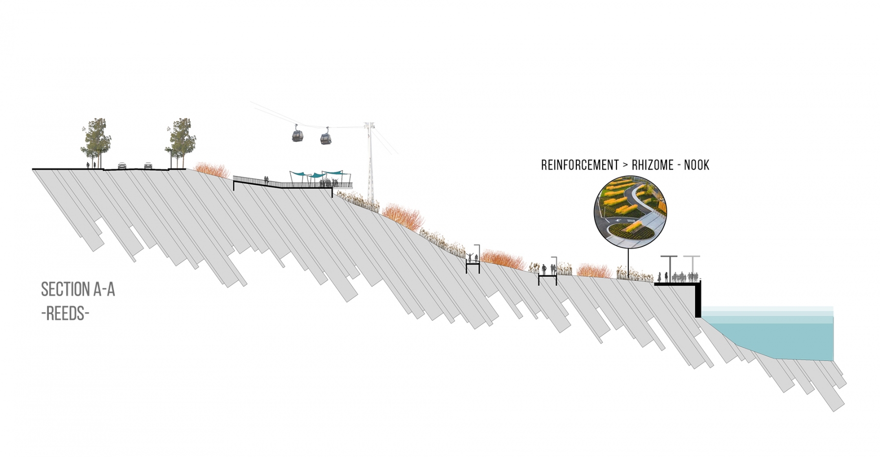 the waterfront is transformed into 5 different worlds, variously furnished with mineral elements that define the anthropic and recreate the human scale, united by spaces that are mostly vegetal. three underground car parks with 120 spaces each are proposed in these connecting spaces, on the terraces of which are arranged places for walks and belle vue. also in these spaces, at carefully selected strategic points, are small cafĂ©-type areas that act as social attractors and vibrant elements. the three levels of the cliff, defined by the natural slope of the land, are exploited through the development of three flows, pedestrian, bicycle and cultural, and through their rational collection and redistribution. the cultural circuit, a sculptural landscape composition, runs upstream and downstream through the existing suite of representative sculptures and develops on a level of complex perspectives, framing and regenerating the works of art as urban landmarks, giving a positive impulse for new artistic projects. the pedestrian/walkway circuit creates the state of mind in which each inhabitant finds himself, in a diverse anthropic arrangement, a cultural path at micro-zonal level in a positive contemplative mood. the walking/biking circuit follows the optimal route that crosses the site in a harmonious and friendly way, putting the participants in the position of travellers on the Danube. the 3 trails intertwine and intersect in a network of confluences that define the trans-european east-west longitudinal axis and act at the same time as urban anchors that attract the Galician population and activate the space. these are either small urban squares, harmoniously combining natural plant elements with urban furniture, or pseudo-amphitheatres. the diversity of the paving gives a “playful” touch to the whole design. the two existing kiosks on landing 1 have been reinstated in an improved and updated form. the project proposes a 4th flow/circuit that complements the other 3 at aerial level, by creating a cable car route linking the Danube waterfront with key urban elements such as Closca, Viva and La Elice parks. in order to strengthen the physical link between the waterfront and the city, it is proposed to integrate the Viva Park into the waterfront development solution. it is to become an intermodal hub for alternative public transport (pedestrian, bicycle and cable car). this link is also marked by the contemporary redesign of the staircases linking landings 1 and 3.
