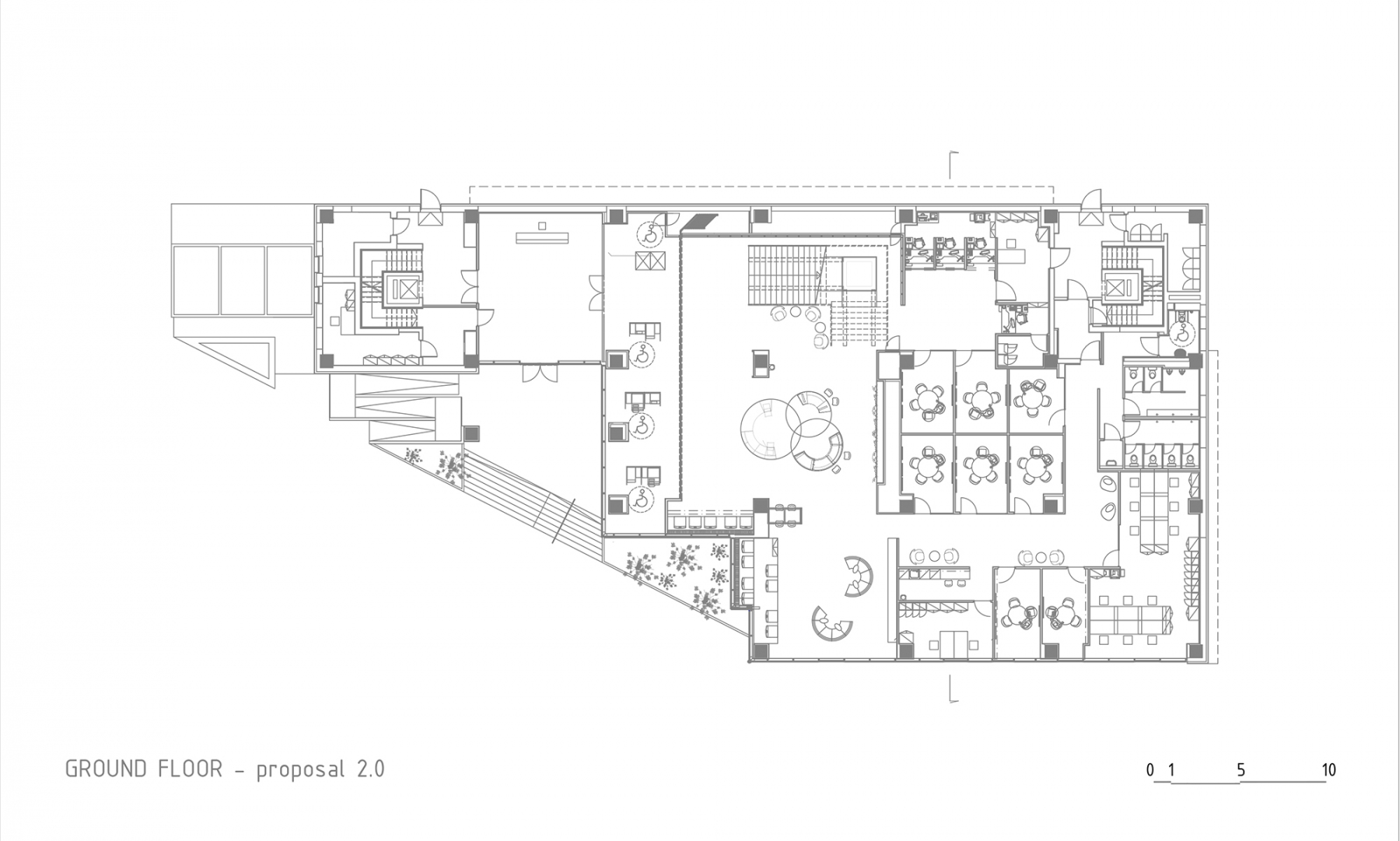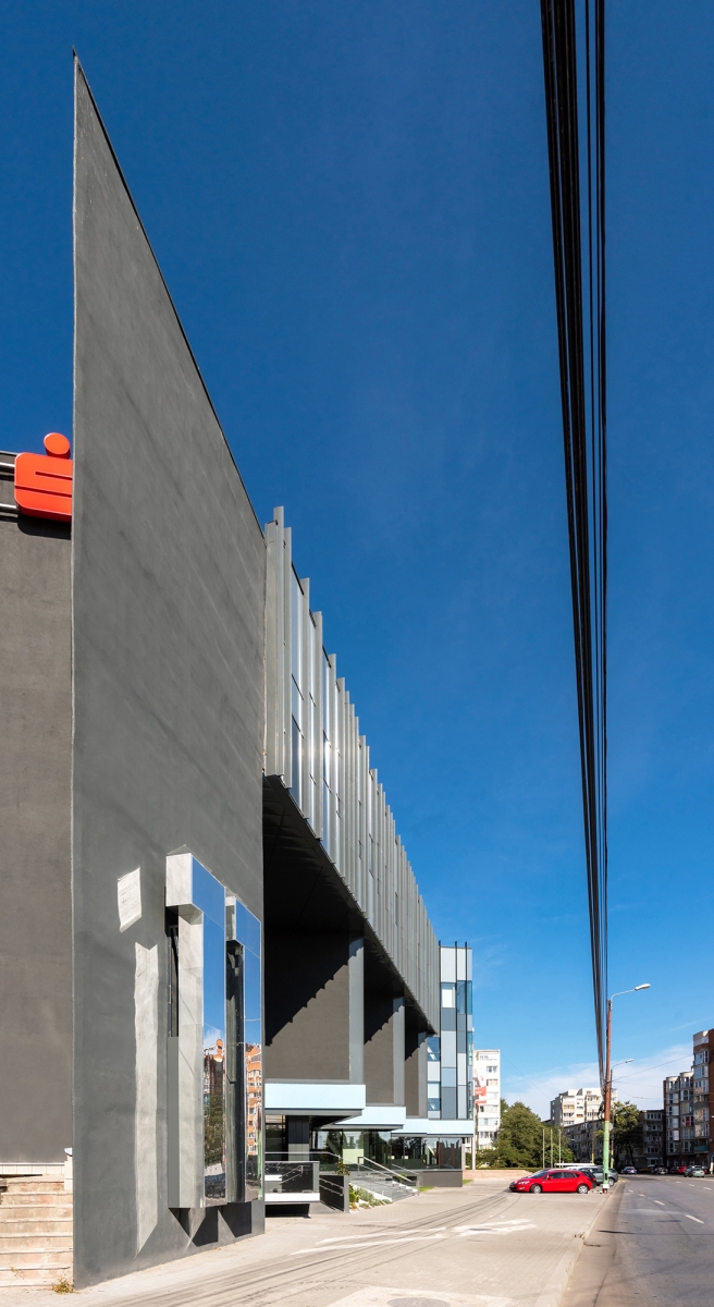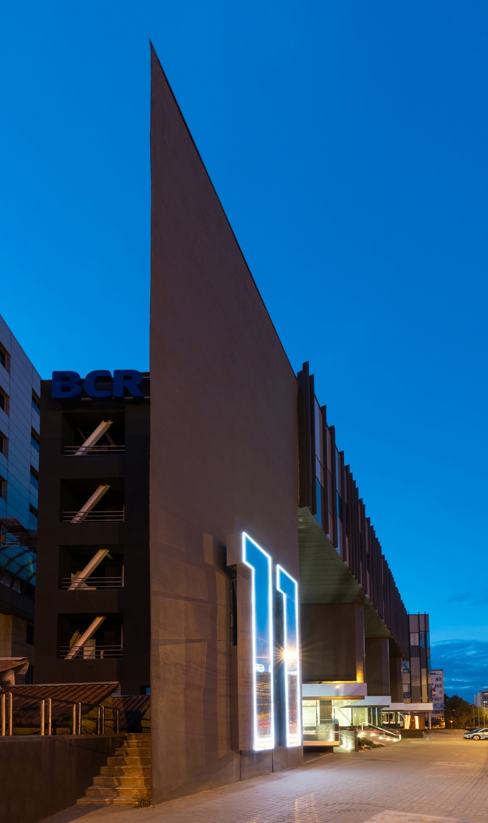 a structure like an abstract waterfall welcomes you at the street front, standing in contrast to the fragmented, impersonal crossroads nearby. this intriguing intervention reshapes the urban landscape, redefining the presence of the regional headquarters of a bank in timișoara. the project embraces a complete interior and exterior transformation, reimagining its spatial distribution and architectural language.