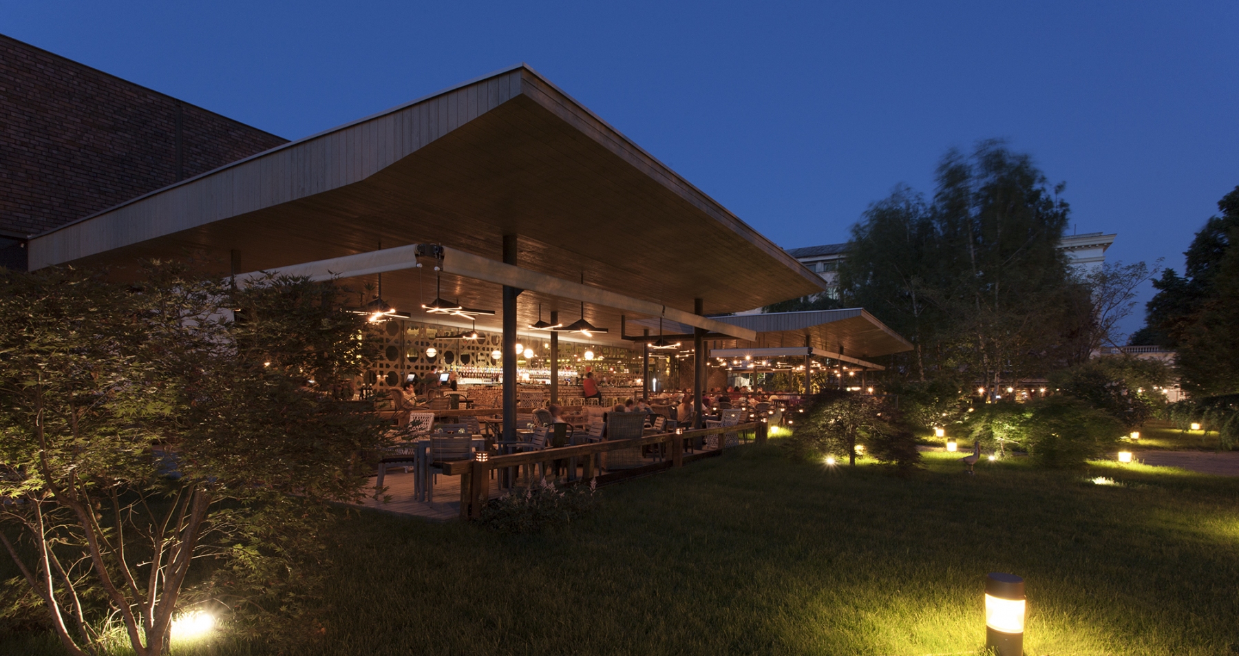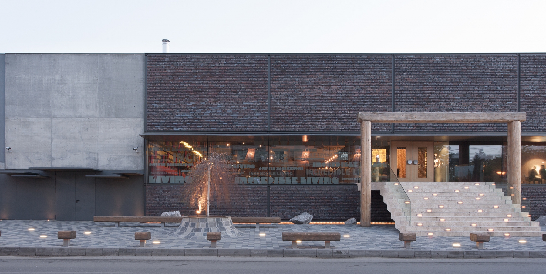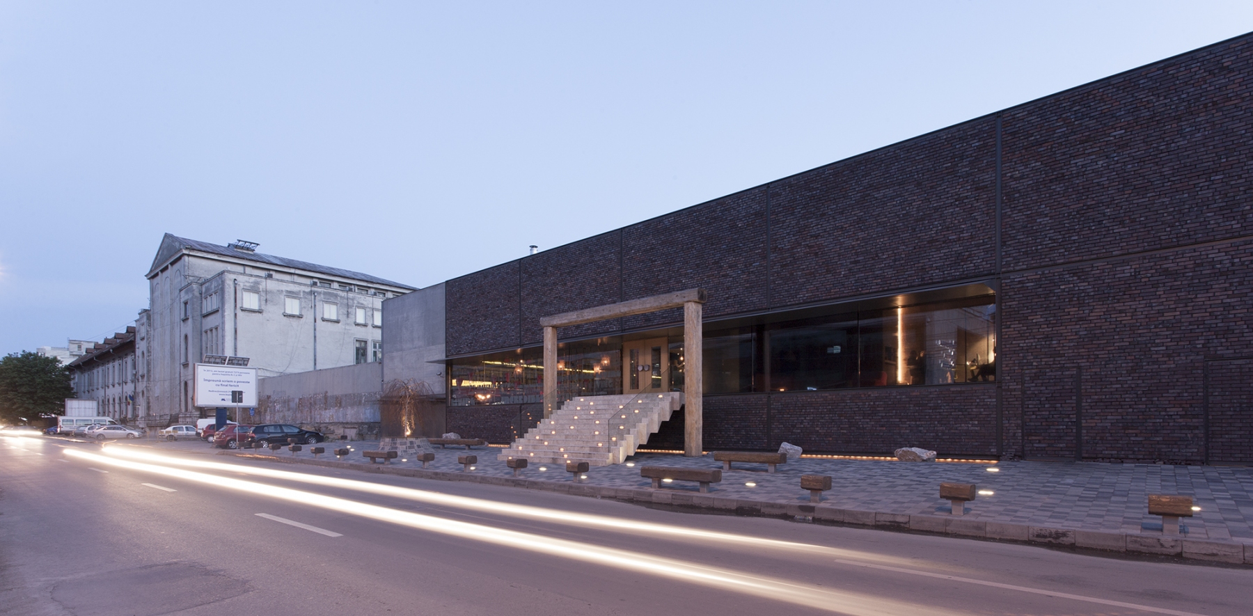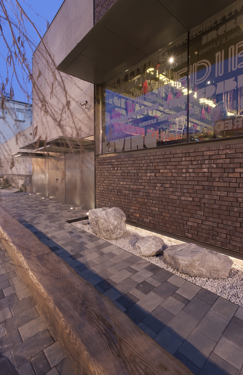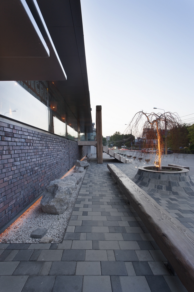 the primary theme we received from the client was that of integrating the concept of an architectural object that would function as restaurant and club in the center of Constanta town on a plot neighbouring on one side the central park and on the other side an important transition street. thus the object was supposed to become the “new place” in town. of course neither in our case the architectural object couldn’t dissociate itself from correctly analyzing, among others, the target of the two major functional spaces: the users. the discussions with the beneficiary turned out the users are mostly the same for both functions but partly completely different. so since the plot on the other hand failed to impose additional constraints on the concept, we realized that the mark of the place is the mark of the moment, of the user, of his present and future spirit for cultural expectations… and we were the ones that had to begin imprinting this mark. the idea of a whole actually not being a whole but two entities to generate the whole decided our gesture and formal discourse that followed. we knew those two worlds meet but don’t want to know each other. it’s like someone would have a double personality and one doesn’t recognize the other while they both live in the same body. the proposal of a “body” with two cosmopolite “minds”, with no prejudices, with no spiritual canons, each of them disposed on the functional space suitable for its own opening to socializing or feeling experiment, has straightly become a materialization of two physical worlds into a binomial of cohabitation: simple and contrasting, human and abstract, concrete and brick. what we’ve been searching for and in the end resulted is the hybrid mechanism in which fake and original, host and intruder, certitude and doubt weave and confuse each other becoming through their own force two powerful elements at the level of the final projection. now and here memories and cultural flashes from all sides can initiate their action and receive for this a universal scene right now and right here and a denial of parametric “orthodoxies” of the day … a blank page.
