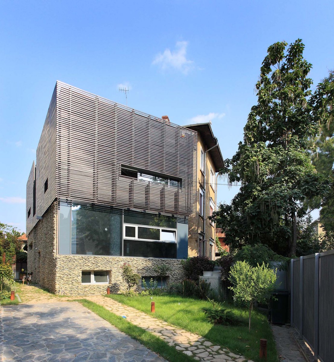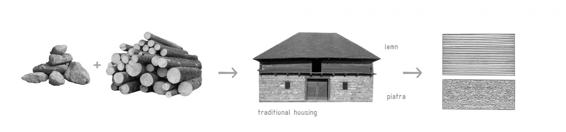 a house affording comfort, confidence and cultural “safety” was, in part, the theme received. in many cultures, old or new, houses are perceived as “friendly”, “human”, “safe” when conceptually there is a “stone” pedestal continued by an upper “wooden” structure. this was the answer that we had to give to the proposed theme: a house with a “stone” pedestal and an upper “wooden” structure.
